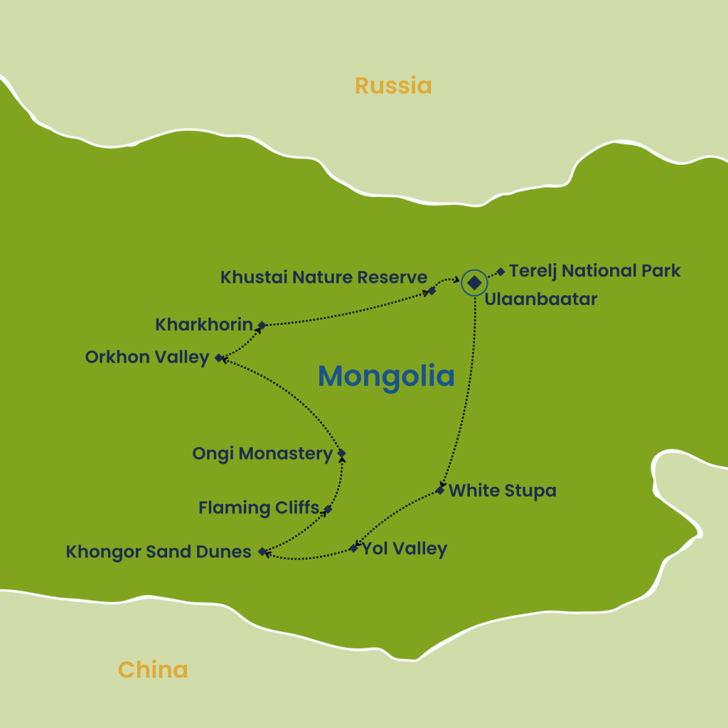 Explore Mongolia on a 12-day journey showcasing its dramatic landscapes and rich history. Begin in Ulaanbaatar, then venture into the Gobi Desert to witness White Stupa cliffs, Yol Valley, and the stunning Khongor Sand Dunes. Discover the Flaming Cliffs and Ongi Monastery before heading to Orkhon Valley and the historic city of Kharkhorin, home to Erdene Zuu Monastery. Experience the wild beauty of Khustai Nature Reserve, spotting rare Przewalski horses, and unwind in Terelj National Park, exploring Turtle Rock and nomadic culture. Conclude with a visit to the iconic Chinggis Khaan Statue and Ulaanbaatar’s cultural landmarks. A truly unforgettable adventure!