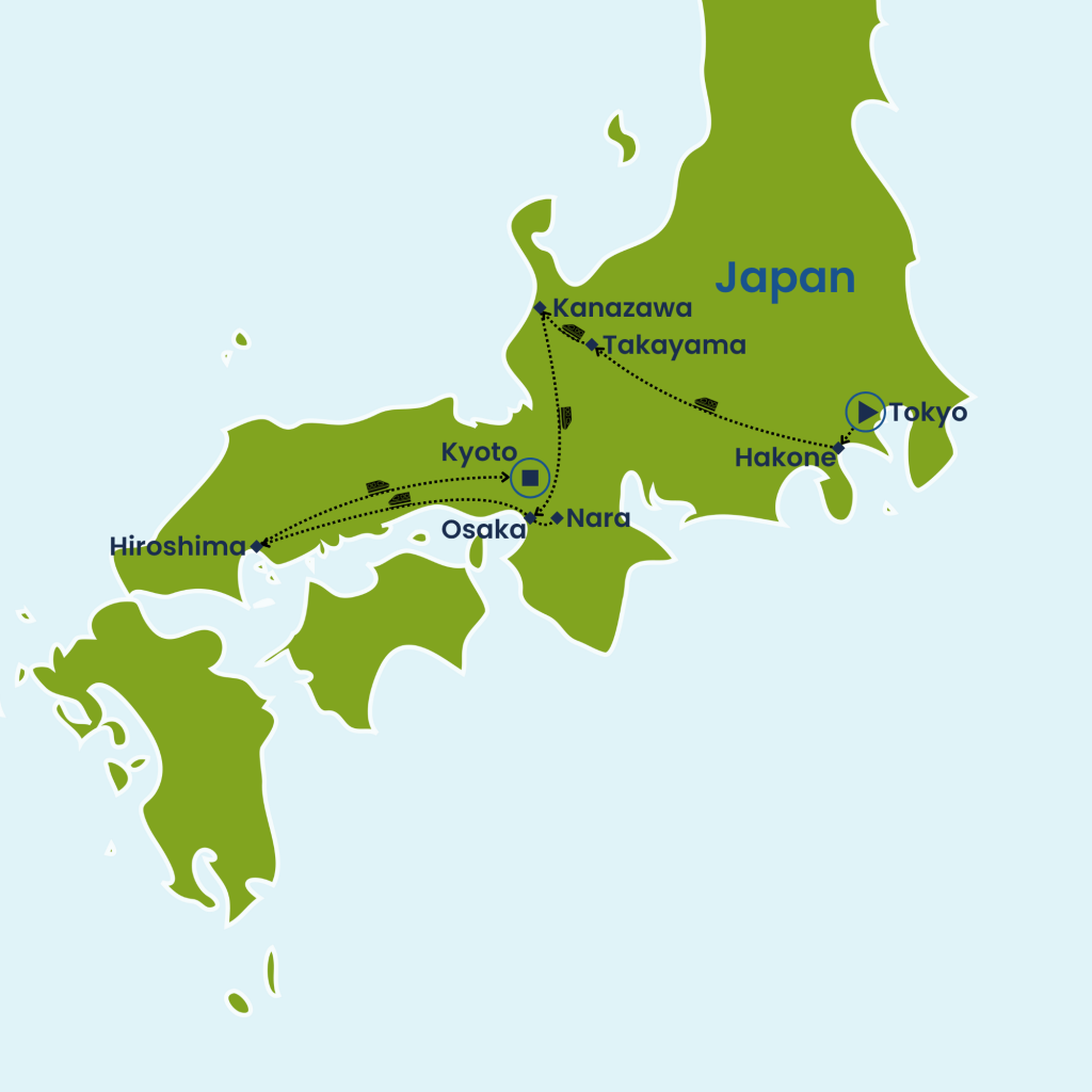 Discover the very best of Japan on this 14-day journey through dynamic cities, historic towns, and stunning landscapes. Start in Tokyo, visiting Meiji Shrine, Senso-ji Temple, and the iconic Shibuya Crossing. Enjoy Mt. Fuji views and a Lake Ashi cruise in Hakone, then explore Takayama’s old town and Shirakawago Village. In Kanazawa, stroll Kenrokuen Garden and the geisha district before experiencing Osaka’s vibrant Dotonbori and castle. Visit Nara’s deer and temples, reflect at Hiroshima’s Peace Park, and see Miyajima’s floating torii. Finish in Kyoto with golden temples, Fushimi Inari’s gates, Gion’s charm, and a memorable Maiko dinner.