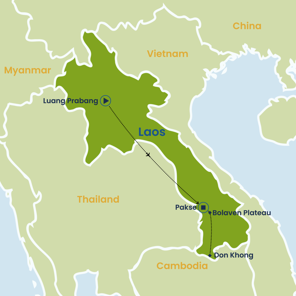 It’s time to say goodbye, but just think of all the wonderful stories you will take home. From the charm of Luang Prabang and the turquoise pools of Kuang Si Falls to the coffee highlands of Bolaven, the ancient ruins of Wat Phu, and the island serenity of Si Phan Don, this journey has been filled with culture, adventure, and unforgettable memories. A transfer will take you to the airport for your onward travels.